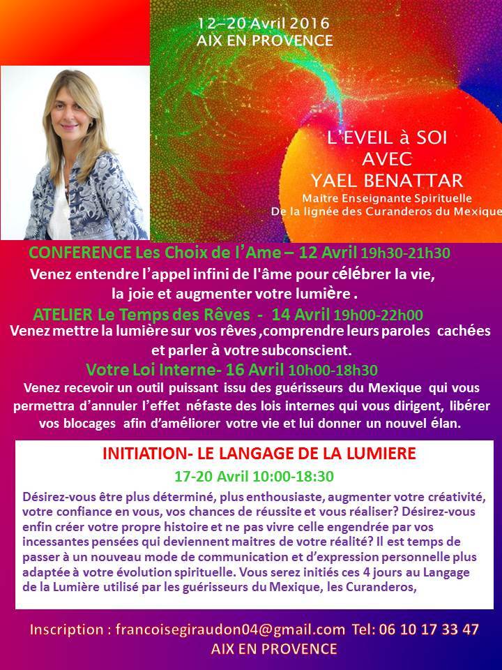 L’éveil à soi avec Yael BENATTAR Geneviève Jullien-Ortega ATELIERS, CONFERENCES 12 avril11 avril mardi 12 avril 16 ---> mercredi 20 avril 16 : 00 h 00 Maître enseignante de la lignée des Curanderos du Mexique RAPPEL DATES : mardi 12 avril 16 - mercredi 20 avril 16 : 00 h 00 [email_link] Les autres évènements dans la catégorie ATELIERS : <em class="pasdactivite">Il n'y a plus d'activités prévues dans cette catégorie, pour le moment...</em>