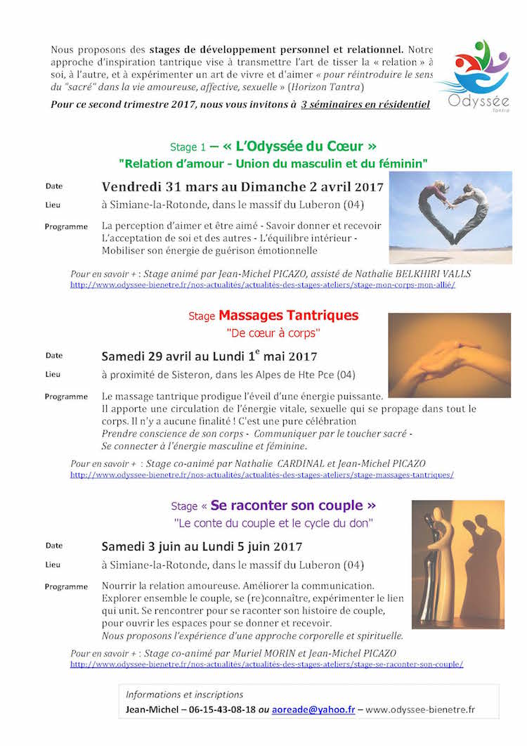 Odyssée Tantra propose AnnB ATELIERS 31 mars3 mars vendredi 31 mars 17 ---> dimanche 2 avril 17 : Toute la journée RAPPEL DATES : vendredi 31 mars 17 - dimanche 2 avril 17 : Toute la journée [email_link] Les autres évènements dans la catégorie ATELIERS : <em class="pasdactivite">Il n'y a plus d'activités prévues dans cette catégorie, pour le moment...</em>